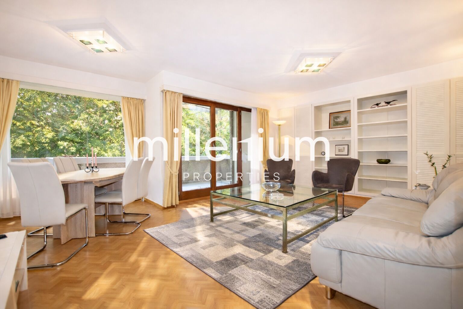 - Ein helles, geräumiges Wohnzimmer mit direktem Zugang zum Balkon mit freiem Blick auf den Park