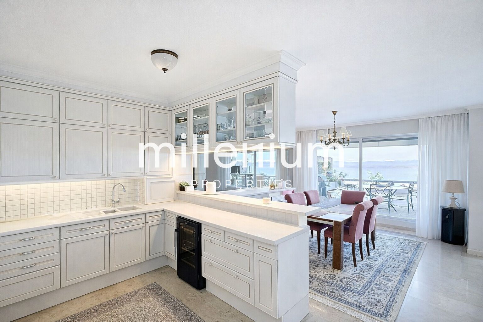 From the entrance, a large hall leads to a double reception with generous volumes, sublimated by exceptional luminosity.