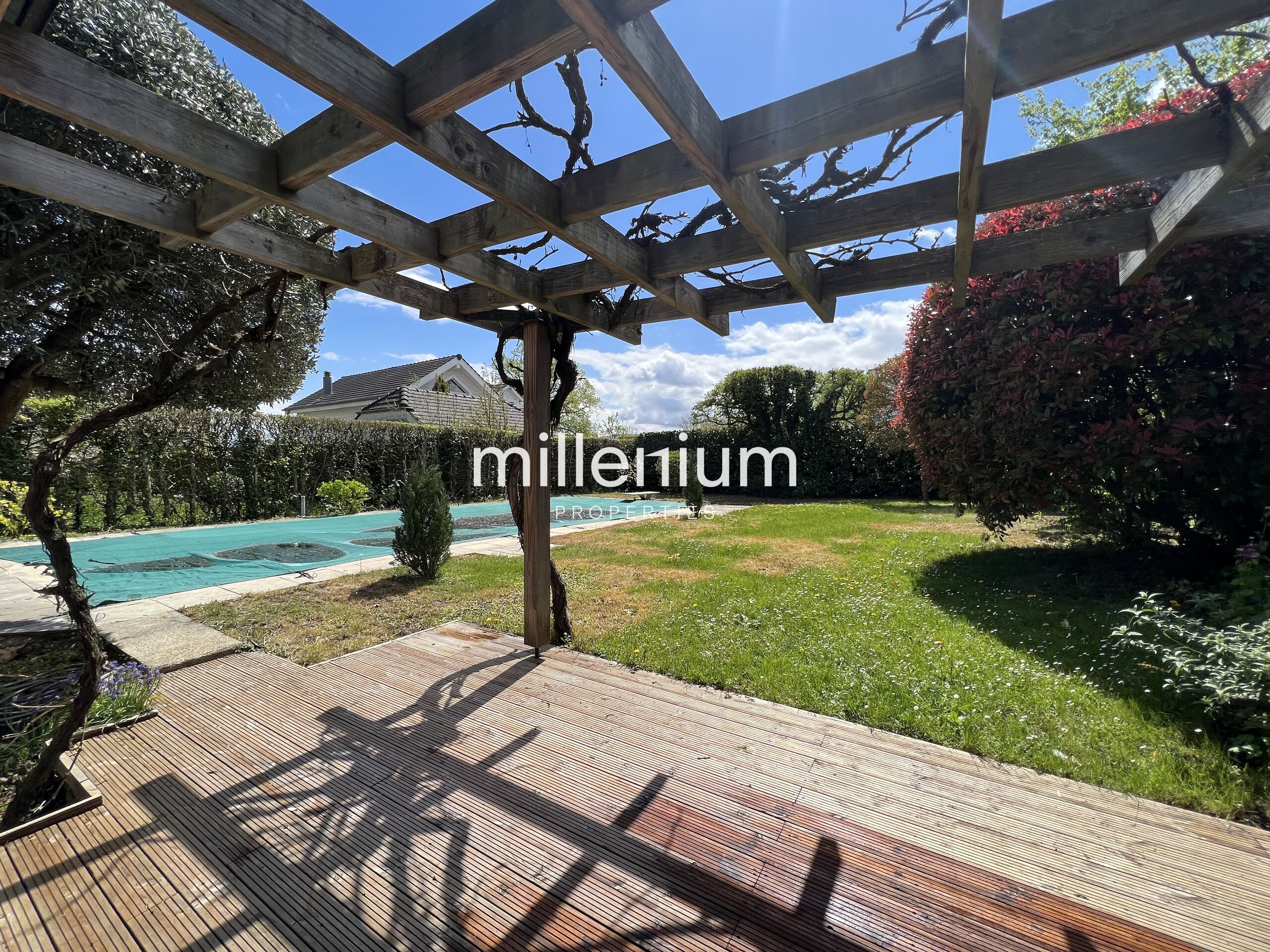 Extérieur : Une jolie terrasse en bois semi couverte, un grand jardin clôturé, une piscine. Un garage pour deux véhicules complète l’ensemble.