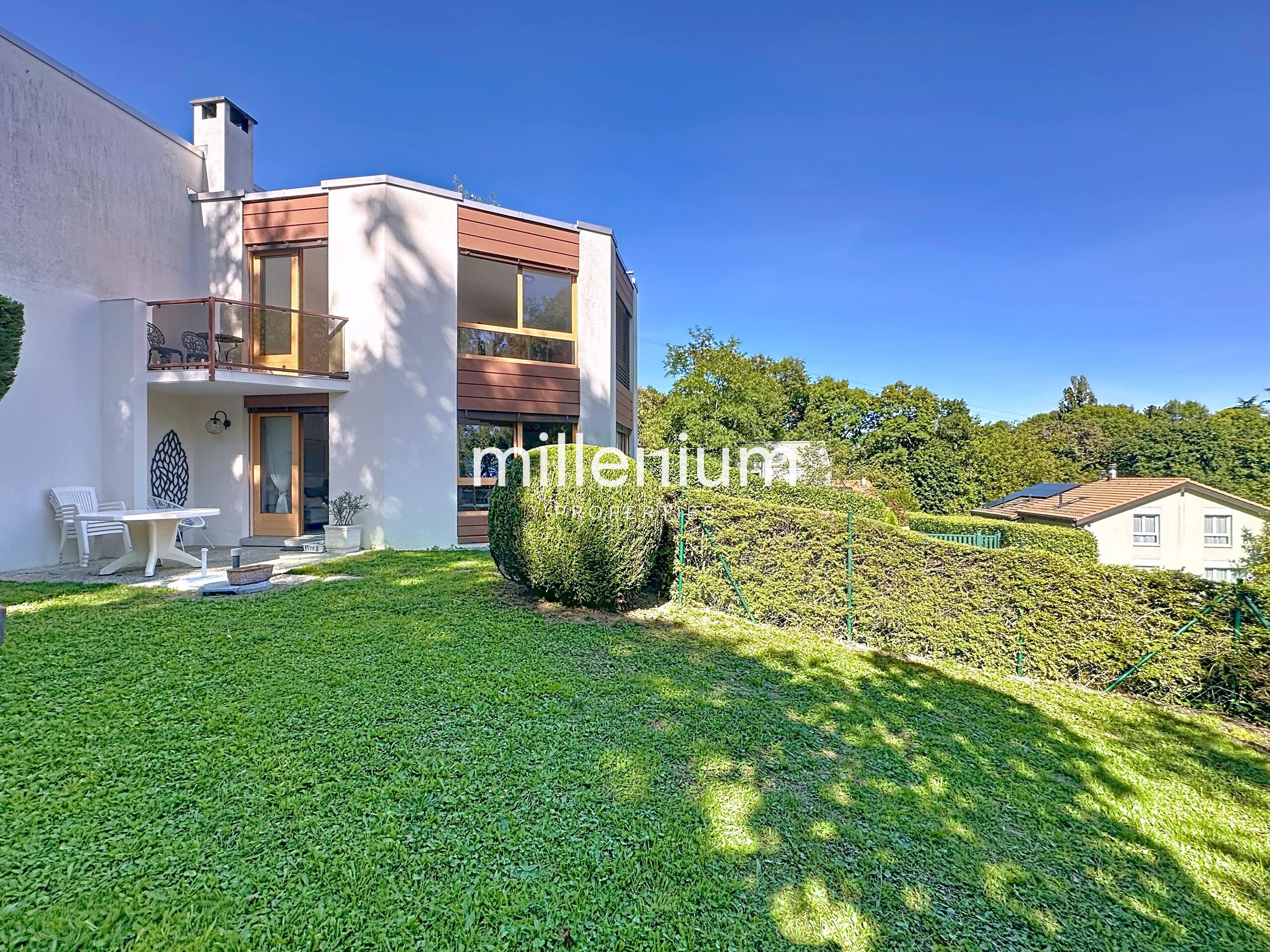 Idéalement située au cœur de la nature tout en restant proche de toutes les commodités, cette propriété bénéficie d’un emplacement privilégié à proximité immédiate des écoles (Institut International de Lancy…), des commerces (Coop…) ainsi que des transports publics (bus et tram).