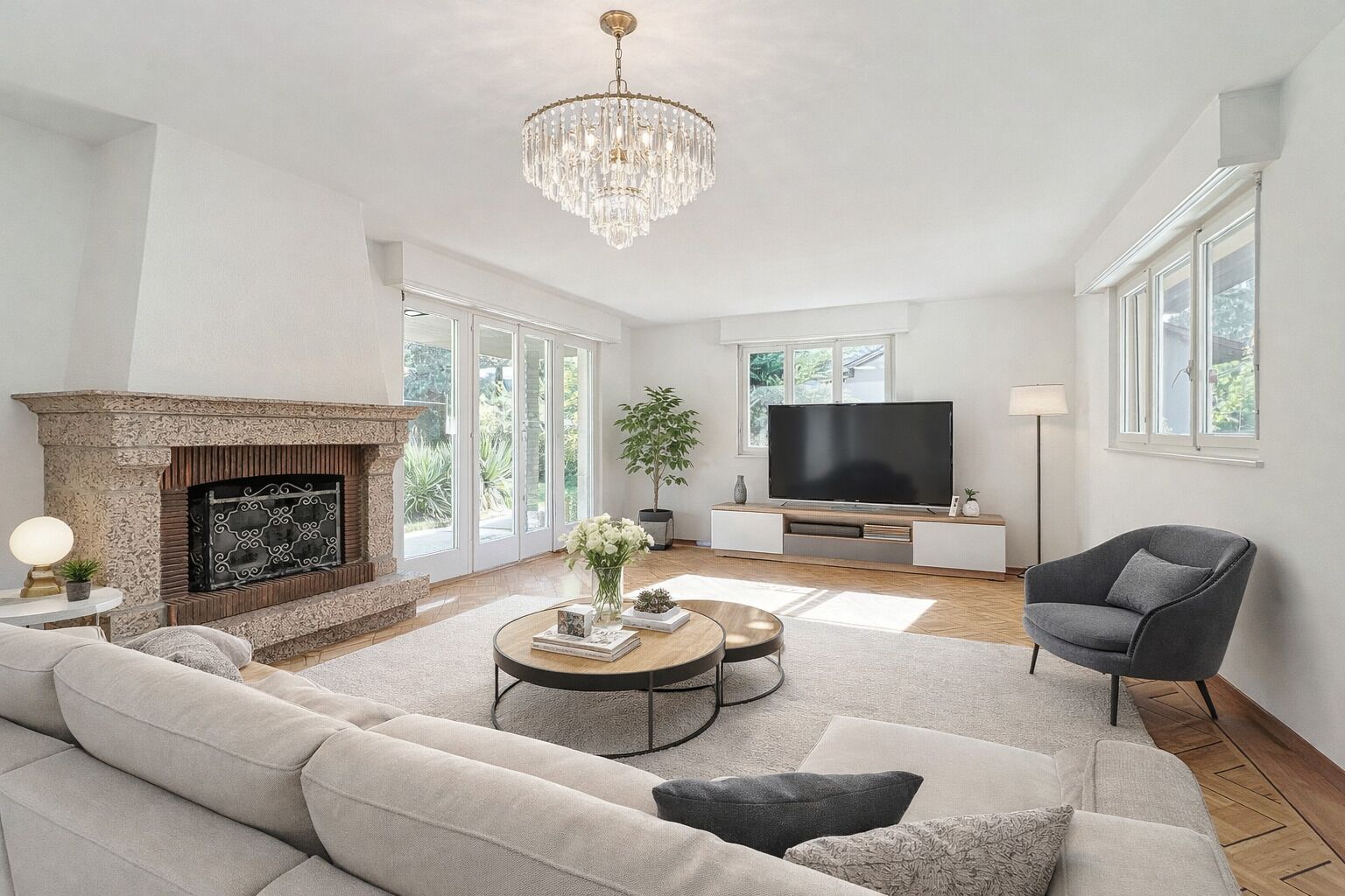 - Bright living room with fireplace, opening onto a 20 sqm terrace and a landscaped garden